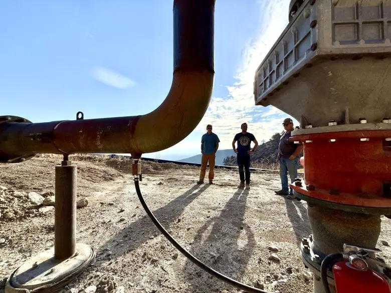 آویدن شندلر، کریس کاسکی و اریک ادواردز یک شیر نصب‌شده را که بخشی از پروژه‌ای برای جذب و از بین بردن متان نشت‌کننده از یک معدن زغال‌سنگ رهاشده در بالای پائونیا است، بررسی می‌کنند. (جیسون بلاوینز، The Colorado Sun)