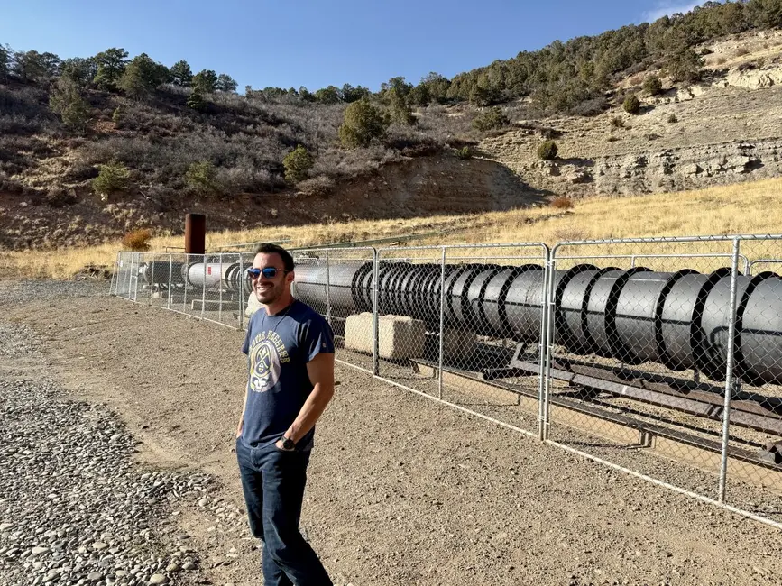 کریستوفر کاسکی از شرکت دلتا آجر و اقلیم، پایداری آشکارسازهای متان را لحظاتی پس از نصب آنها بر فراز معدن سابق Mid-Continent Coal and Coke Co. در تاریخ ۲۳ آگوست ۲۰۲۳، نزدیک ردستون، بررسی می‌کند. سایت‌های معدنی رهاشده از قرن نوزدهم و بیستم در منطقه Coal Basin، متان، گازی گلخانه‌ای مضر، نشت می‌کنند. دستگاه‌های کاسکی میزان دقیق متان سرازیر شده از این معادن گازدار را اندازه‌گیری می‌کنند. (هیو کری، The Colorado Sun)