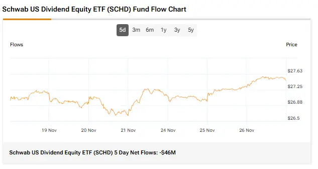 براساس دادههای TipRanks، SCHD در دوره ۵ روزه جریان خالص حدود -۴۶ میلیون دلار ثبت کرده است که نشان میدهد در پنج روز معاملاتی اخیر، سرمایهگذاران پول بیشتری از ETF SCHD برداشتند تا آنچه افزودند.