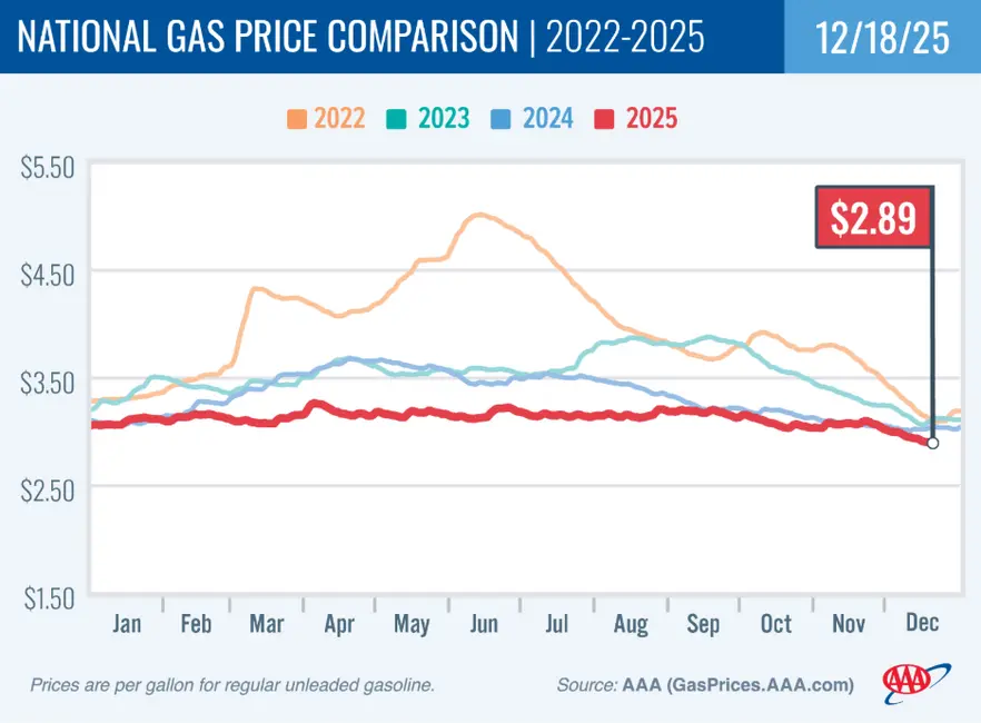 به گفته این گزارش، متوسط قیمت ملی بنزین معمولی به ۲٫۸۹ دلار کاهش یافت و ارزان‌ترین قیمت‌های دسامبر از سال ۲۰۲۰ را نشان می‌دهد.