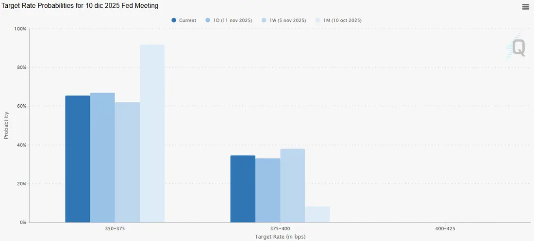 با کمتر از یک ماه زمان تا تصمیم سیاست پولی فدرال رزرو که برای ۱۰ دسامبر برنامهریزی شده است، مدل احتمال گروه CME نشان میدهد که بازار هنوز یک کاهش نرخ ۰.۲۵٪ را پیشبینی میکند که نرخ مرجع را از ۴٫۰۰٪ به ۳٫۷۵٪ کاهش میدهد. اگرچه یک ماه پیش احتمال این کاهش بیش از ۹۰٪ بود، اما اکنون به ۶۵٪ کاهش یافته است، اما هنوز انتظار قوی بازار برای کاهش نرخ تا پایان سال در جلسه بعدی فدرال رزرو را نشان میدهد.
