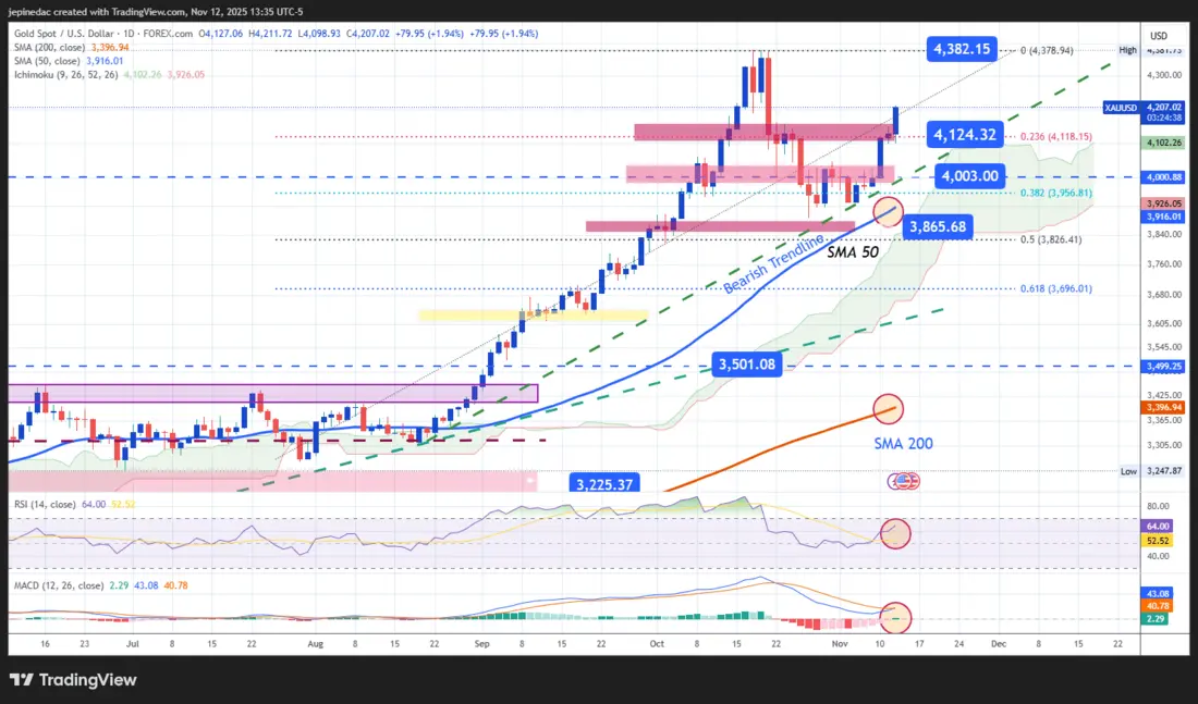 XAU/USD هماکنون چهار جلسه صعودی متوالی در کوتاهمدت ثبت کرده است و حدود ۵.۴٪ رشد داشته است. این فلز حتی سعی کرد در نزدیکی سطح ۴,۲۰۰ دلار در هر اونس تثبیت شود.