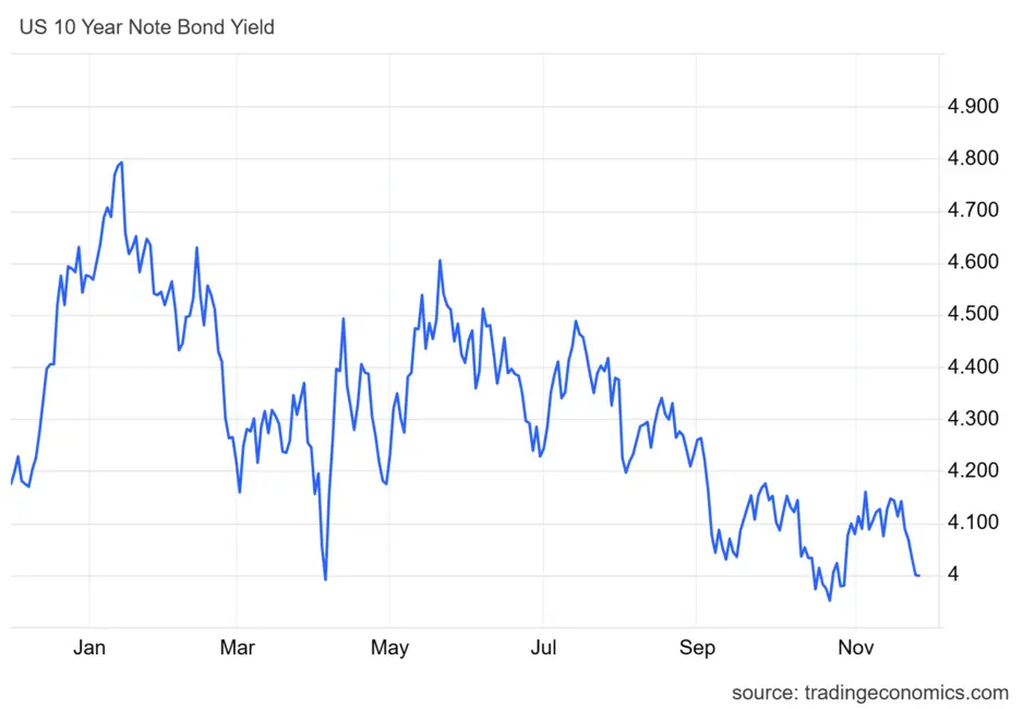 با این حال، این انتظارات محیط منفی برای نرخ بازده ۱۰‑ساله خزانهداری ایجاد کردهاند، که یکی از مهمترین داراییها نسبت به طلا محسوب میشود. تنها چند روز پیش، بازدهها نزدیک به ۴٫۲٪ بودند، اما از آن زمان به زیر ۴٫۰۰٪ کاهش یافتهاند، که نشانگر منطقهٔ پایداری کوتاهمدت آن است. کاهش بازدهها تقاضا برای اوراق قرضه را کم کرده و بخشی از بازار به سمت طلا بهعنوان دارایی امن متمایل شده است، که به بهبود اخیر آن کمک میکند.
