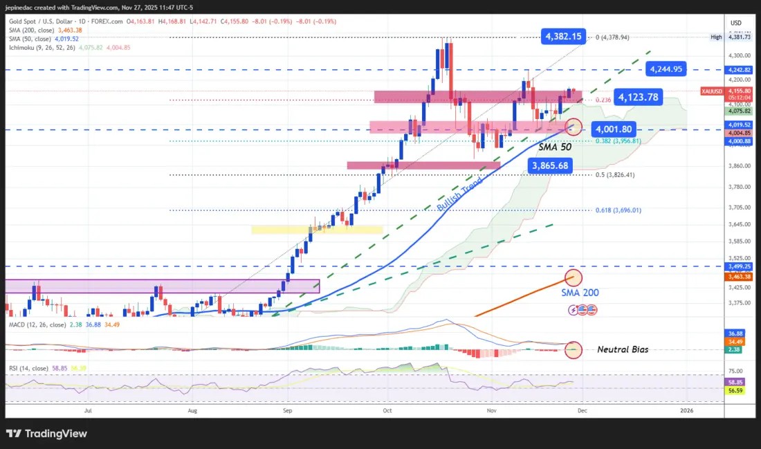 با نزدیک شدن به انتهای هفته معاملاتی، حرکت قیمت طلا همچنان سوگیری صعودی ثابت را نشان میدهد و در پنج سیشن گذشته بیش از ۲٫۵٪ افزایش داشته است. فشار خرید به دلیل ضعف در داراییهای جایگزین—مانند اوراق قرضه ۱۰‑ساله خزانهداری ایالات متحده—و همچنین عدم بهبود کامل اعتماد بازار، که به تثبیت بازگشت کوتاهمدت فلز کمک کرده، حفظ شده است. اگر این شرایط ادامه یابد، فشار خرید میتواند در سیشنهای آینده حاکم بماند.