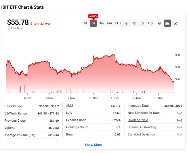 امروز IBIT ۳٪ کاهش یافت و در معاملات پایانی به ۵۵٫۸۶ دلار رسید. اصلیترین عامل کاهش، قیمت بیتکوین بود که ۳٫۰۳٪ سقوط کرده و به ۹۸٬۵۷۸٫۱۰ دلار رسید.
