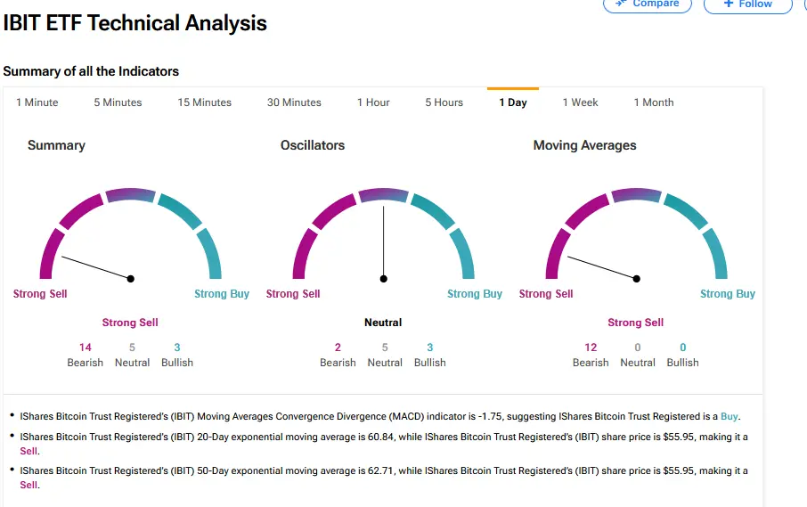 بر اساس تحلیل تکنیکال TipRanks، IBIT هماکنون با توافق «فروش قوی» مواجه است؛ ۱۴ رأی نزولی، ۵ رأی خنثی و ۳ رأی صعودی.