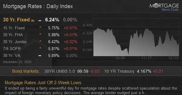 با وجود گمانهزنیهای پراکنده دربارهٔ تأثیر تصمیمات پولی خارجی، روزی نسبتاً بیحادثه برای نرخهای وام مسکن بود. میانگین نرخها کمی بالا رفت و منجر به دومین کمترین مقدار این هفته شد. بهجز دیروز، آخرین روزی که نرخها پایینتر بودند، بیش از دو هفته پیش؛ یعنی ۴ دسامبر، بود.