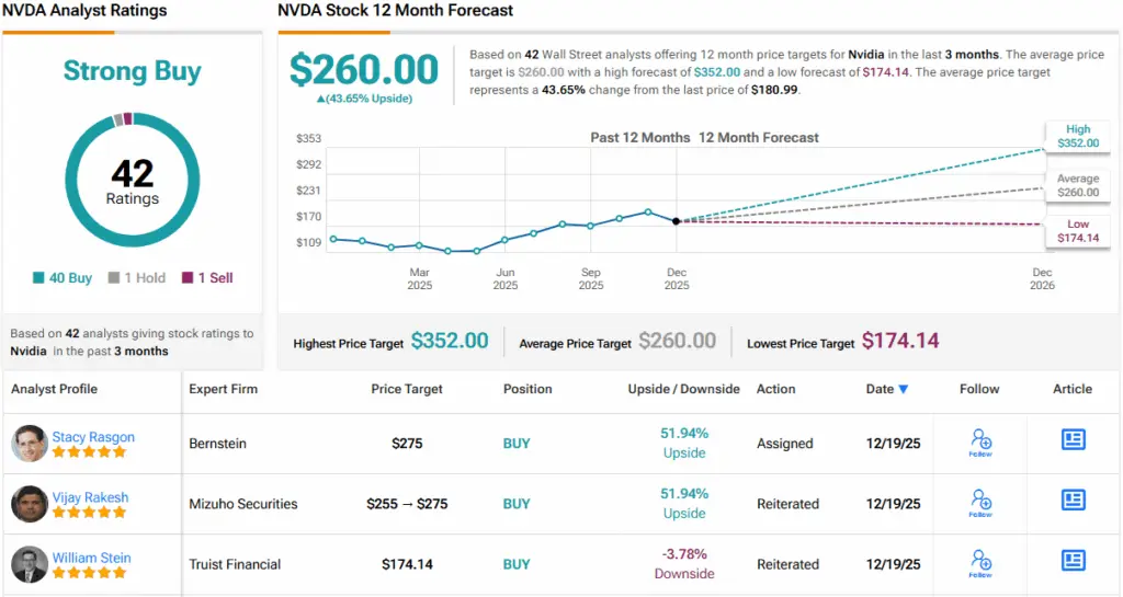 پس این نظرات فاینست است، اما دیگر سرمایه‌گذاران در «خیابان» دربارهٔ چشم‌اندازهای Nvidia چه نظری دارند؟ بر پایهٔ ۳۹ رای خرید، یک رای نگه‌داری و یک رای فروش، این سهام امتیاز توافقی خرید قوی دریافت کرده است. پیش‌بینی‌ها بازدهی ۱۲‑ماهه حدود ۴۴٪ را پیش‌بینی می‌کند، در حالی که هدف قیمت متوسط ۲۶۰ دلار است. (به پیش‌بینی سهام Nvidia مراجعه کنید)
