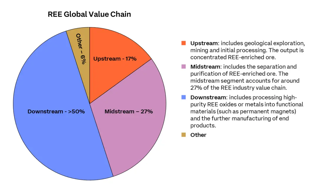 در حال حاضر، چین در تمام زنجیره تأمین تسلط دارد؛ بهطوری که ۷۰٪ استخراج مواد معدنی اولیه عناصر خاکی نادر و حدود ۹۰٪ فرآوری میانی/پایانی را در اختیار دارد. ۹۴٪ آهنرباهای دائمی جهان در چین تولید میشوند. این تسلط چین حاصل سرمایهگذاری دولتی زودهنگام و مستمر، اعمال محدودیتهای صادراتی، هزینههای کار ارزان و اجرای نسبی قوانین محیطزیست است.