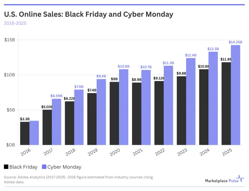 دههٔ گذشته داستان سه نقطهٔ تحول دراماتیک و سپس عادیسازی مداوم را نقل میکند. در سال ۲۰۱۷، فروش آنلاین جمعهسیاه بهطور چشمگیری ۵۰.۶٪ افزایش یافت و به ۵٫۰۳ میلیارد دلار رسید، در حالی که فروش دوشنبهسایبر ۹۱٪ رشد کرد و به ۶٫۵۹ میلیارد دلار رسید؛ این پیشرفت تجارت موبایلی بود که رفتار خرید را بهطور اساسی دگرگون کرد. پاندمی سال ۲۰۲۰ فروش جمعهسیاه را به ۹٫۰ میلیارد دلار (+۲۱.۶٪) و فروش دوشنبهسایبر را به ۱۰٫۸ میلیارد دلار (+۱۴.۹٪) ارتقا داد و سالها از پیشبینی پذیرش دیجیتال را در چند ماه فشرده کرد. سپس بحران زنجیرهٔ تأمین در سال ۲۰۲۱ رخ داد که تنها افتهای سالانه در کل مجموعه داده را بهوجود آورد: فروش جمعهسیاه ۱.۱٪ کاهش یافت و فروش دوشنبهسایبر ۰.۹٪ افت داشت.