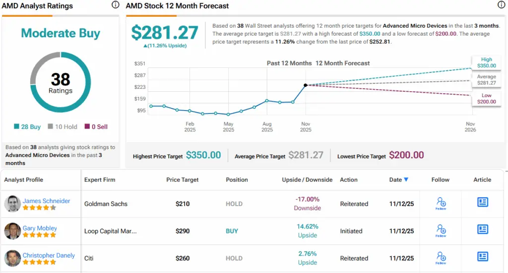 با نگاهی به تجزیه و تحلیل اجماعی، که ترکیبی از ۲۸ رأی خرید در مقابل ۱۰ رأی نگهداری است، این سهم رتبهٔ اجماعی «خرید متوسط» (Moderate Buy) را دریافت میکند. پیشبینیها بازدهی ۱۲‑ماهه ۱۱٪ را نشان میدهد، با هدف متوسط قیمت ۲۸۱٫۲۷ دلار. (پیشبینی سهام AMD را ببینید)