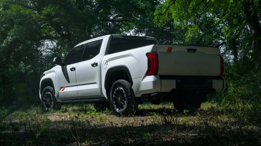 شاحنه سفید تویوتا با گریل مشکی و برچسب‌های خط قرمز-زرد، پارک شده روی چمن در دل جنگل