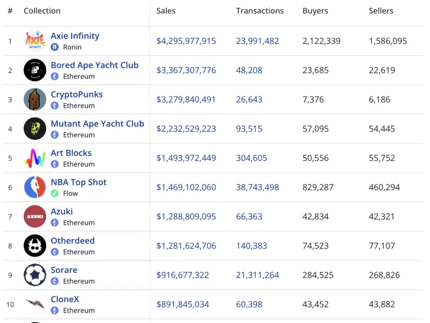 بالاترین فروش NFT، The Merge توسط Pak بود که در ۲ دسامبر ۲۰۲۱ با قیمت شگفت‌انگیز ۹۱.۸ میلیون دلار معامله شد. پیش از آن، اثر Beeple’s Everydays: The First ۵۰۰۰ Days با ۶۹.۳ میلیون دلار در مزایده Christie’s به فروش رسید. فراتر از تک‌تکه‌ها، هشت مجموعهٔ NFT وجود داشت که انتشارهایشان به بیش از یک میلیارد دلار رسید، طبق CryptoSlam. ناشران قابل‌توجه شامل Axie Infinity با $۴.۳ billion؛ Bored Ape Yacht Club با $۳.4B؛ CryptoPunks با $۳.3B؛ Mutant Ape Yacht Club با $۲.2B؛ و #۶ شامل NBA Top Shot با $۱.5B.