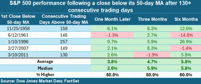 حتی اگر این عقبنشینی رخ دهد، هر شکستی زیر میانگین متحرک ۵۰ روزه معمولاً شروع یک بازار خرسی طولانیمدت برای S&P 500 را نشان نمیدهد. بازده در سه ماه و شش ماه به طور تاریخی مثبت بوده است، طبق دادههای Dow Jones Market Data.