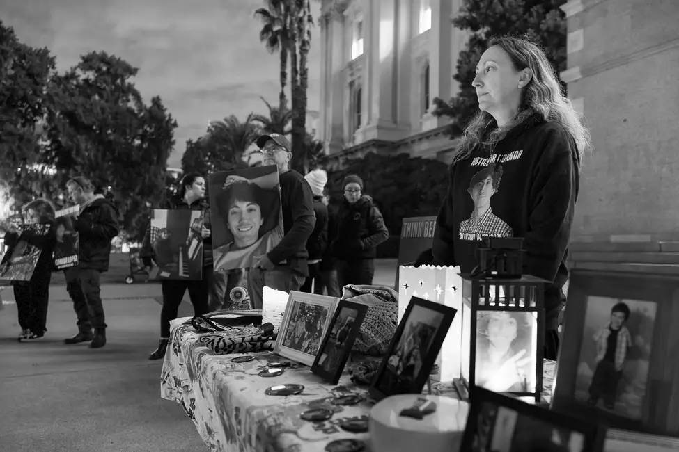 آلیسون لیمن در کنار میزی ایستاده که به یاد پسرش، کانر، که پیش از شروع مراسم شمع‌افروزی برای روز جهانی یادبود قربانیان تصادفات جاده‌ای در کاپیتول ساکرامنتو، در ۱۶ نوامبر ۲۰۲۵، در یک تصادف رانندگی کشته شد، احترام می‌گذارد. عکس توسط فرید گریوز برای CalMatters