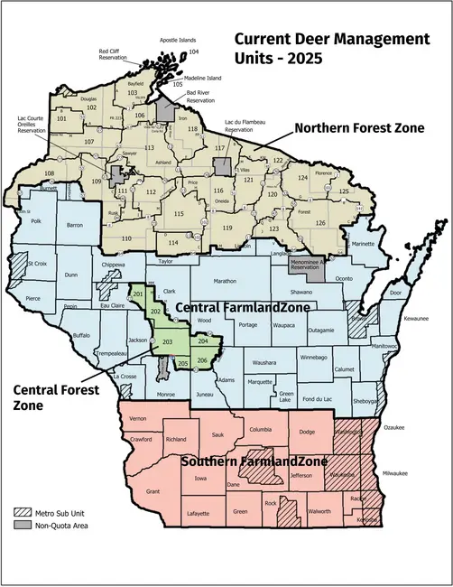 در اینجا نقشهٔ مناطق و واحدهای مدیریت گوزن ۲۰۲۵ اداره منابع طبیعی ویسکانسین آمده است.